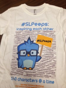 All the grey is the names of the most active #SLPeeps. I’m sure not everyone is on there because 1) there are new #SLPeeps every day, and 2) there is only so much room on a shirt. So we took the ones who posted fairly regularly and used those names. Hopefully no one is offended…and hopefully when we re-work the logo, it’ll need a front and back because there are so many #SLPeeps out there.