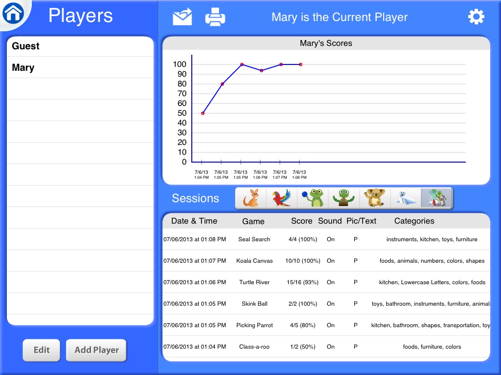 The app keeps data for each student. A line graph indicates percent accuracy and the date. There is also a narrative section which shows date/time of session, game, score, whether it was picture or text, and the categories worked on. The app keeps every individual game as its own data section – so if the student has played 4 games in one session, he or she will have 4 data points in both the line graph and the narrative information. I have mixed feelings about this – I recognize that information breakdown is valuable, but it is also very clunky.