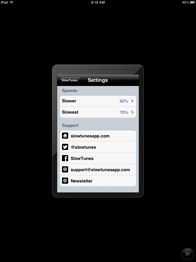 Customization: On the main screen, there is the “gears” icon for settings. There you can change the speeds, sign up for newsletters, or get support. The default speeds for “slower” is 90% and “slowest” is 80%, but you can slow it even more than that.