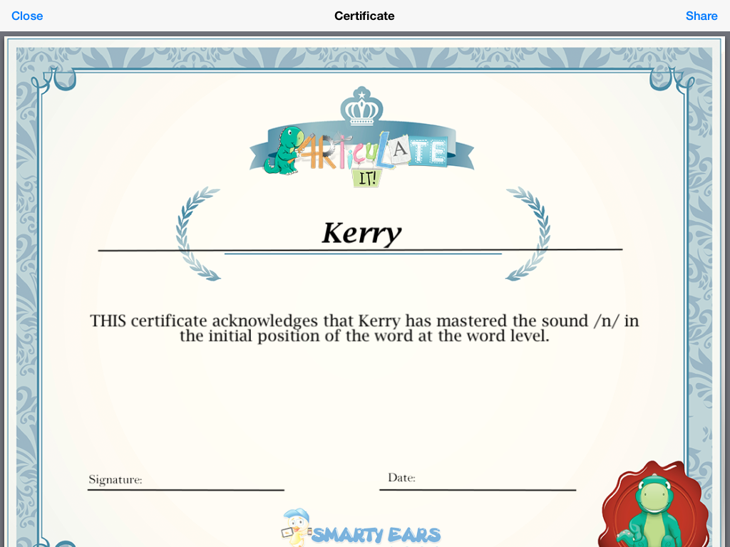 Smarty Ears has ingeniously designed a Certificate of Achievement that can be personalized for each child indicating their name, date, and sound they have mastered.