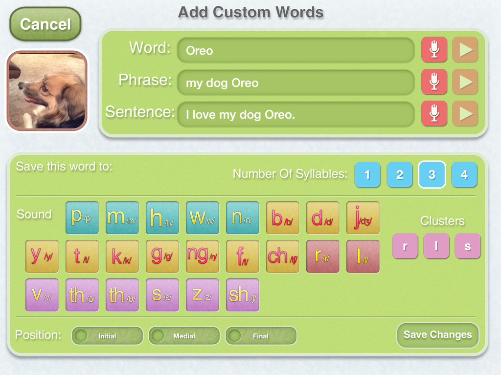 In addition to all the words that are built into the app, Articulate it! allows the individual to ADD custom words. The SLP/Adult can take a picture, determine the word-phrase-sentence to be used with that picture, record the audio, and determine where the picture will be used (which phoneme will it be placed under).