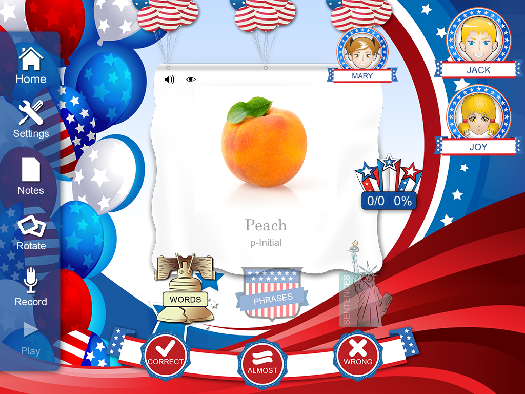 The avatars for the individual students will show on the side of the screen, with various controls on the other side. At any point, the SLP can change settings, move from word to phrase to sentence, and select correct – almost correct – incorrect.