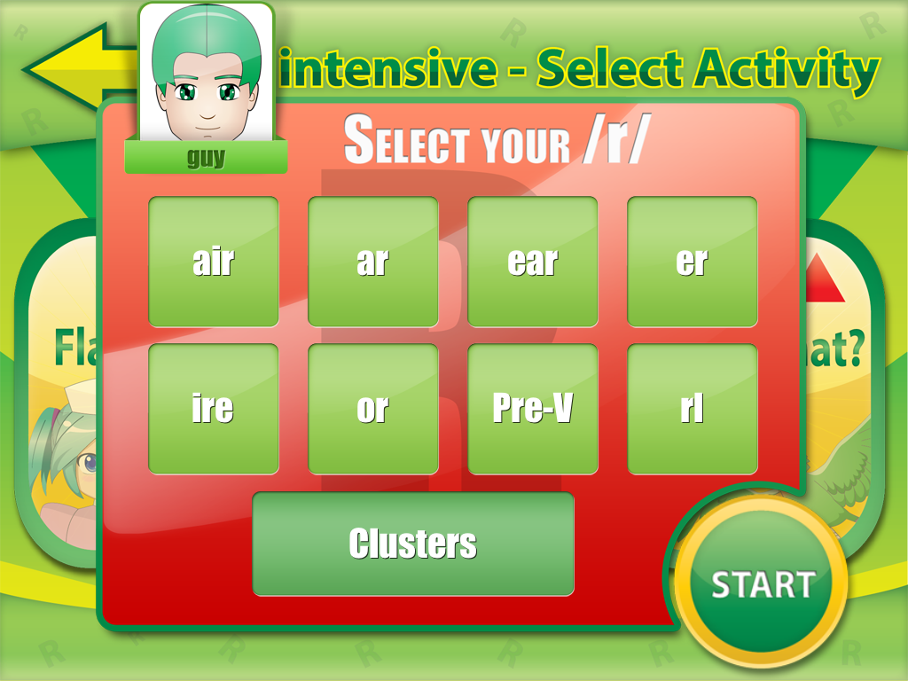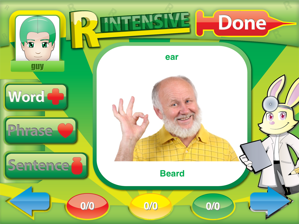 R Intensive…is just that intensive work with /r/. In R Intensive, you can choose with variation of /r/ to work on. For instance, if your focus is on prevocalic R, simply tap on that screen. However, if you’re looking for specific post-vocalic /r/ (say “air” or “ire”) you can choose to select one of those sounds (or both for that matter!).
